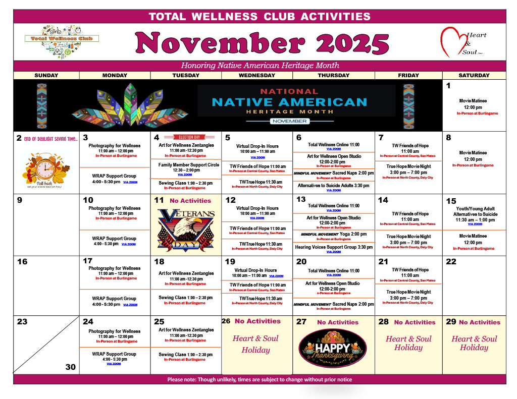 Wellness activities, support groups, connection, and healing through the power of peer support.